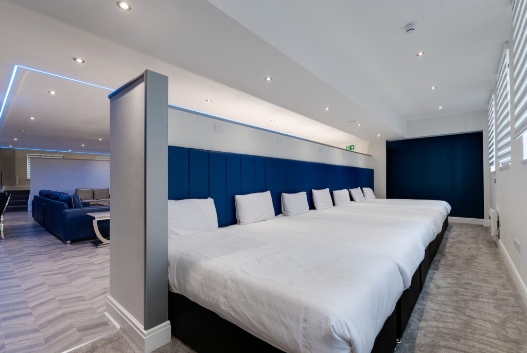 The apartment has parquet floors, a seating area with a flat-screen TV with streaming services, a wardrobe, an electric kettle, as well as a sofa. The unit has x14 single beds, 7 in each bedroom.